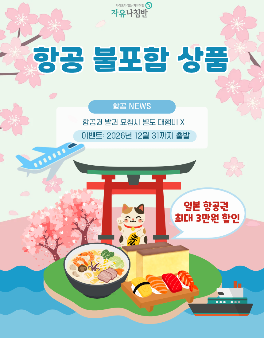 도쿄 가족여행, 친목여행✈️ 우리끼리만 편하게 갈 수 없을까❓ 고민하시던 부분을 시원하게 해결해드리는 자유나침반여행사의 일본 도쿄 세미패키지 상품‼️ 패키지의 편리함과 자유여행의 여유로움 장점만 쏙쏙 뽑아 만든 특별한 우리만의 맞춤 단독 도쿄 여행을 만나보세요. ✔️ 체크포인트 1. 전담 베테랑 가이드 배정되나요? 눈치 볼 필요 없어요! 일본어를 몰라도 OK! 자유나침반여행사 도쿄 전문 가이드가 오직 고객님 일행 만을 세심하게 케어해 드립니다. ✔️ 체크포인트 2. 프라이빗 전용 차량 이동은 뭔가요? 교통비가 비싸고 환승이 복잡한 일본에서, 우리끼리만 탑승하는 자유나침반여행사 단독 전용 차량으로 쾌적하게 이동하세요. ✔️ 체크포인트 3. 후쿠오카 특식포함에 대해 설명 해주세요. 자유나침반여행사의 단독 세미패키지 에는 도쿄에서 엄선한 맛있는 특식이 포함되어 있습니다. ✔️ 체크포인트 4. 부모님과 이이가 있는 가족인데 우리만의 맞춤 일정 조율이 되나요? 자유나침반여행사 도쿄세미패키지는 원하는 명소는 넣고, 힘든 코스는 빼고! 일행의 취향과 체력에 맞춰 자유롭게 일정을 조정할 수 있습니다. ※본 상품은 실시간 호텔 요금을 반영하고 있어, 예약하시는 시기 및 여행 일정에 따라 최종 상품가가 변동될 수 있습니다. ※안내해 드린 일정은 예정 일정표이며, 개인의 항공스케줄 등에 따라 변경될 수 있으니 담당자를 통해 확정 일정을 확인해 주시기 바랍니다.